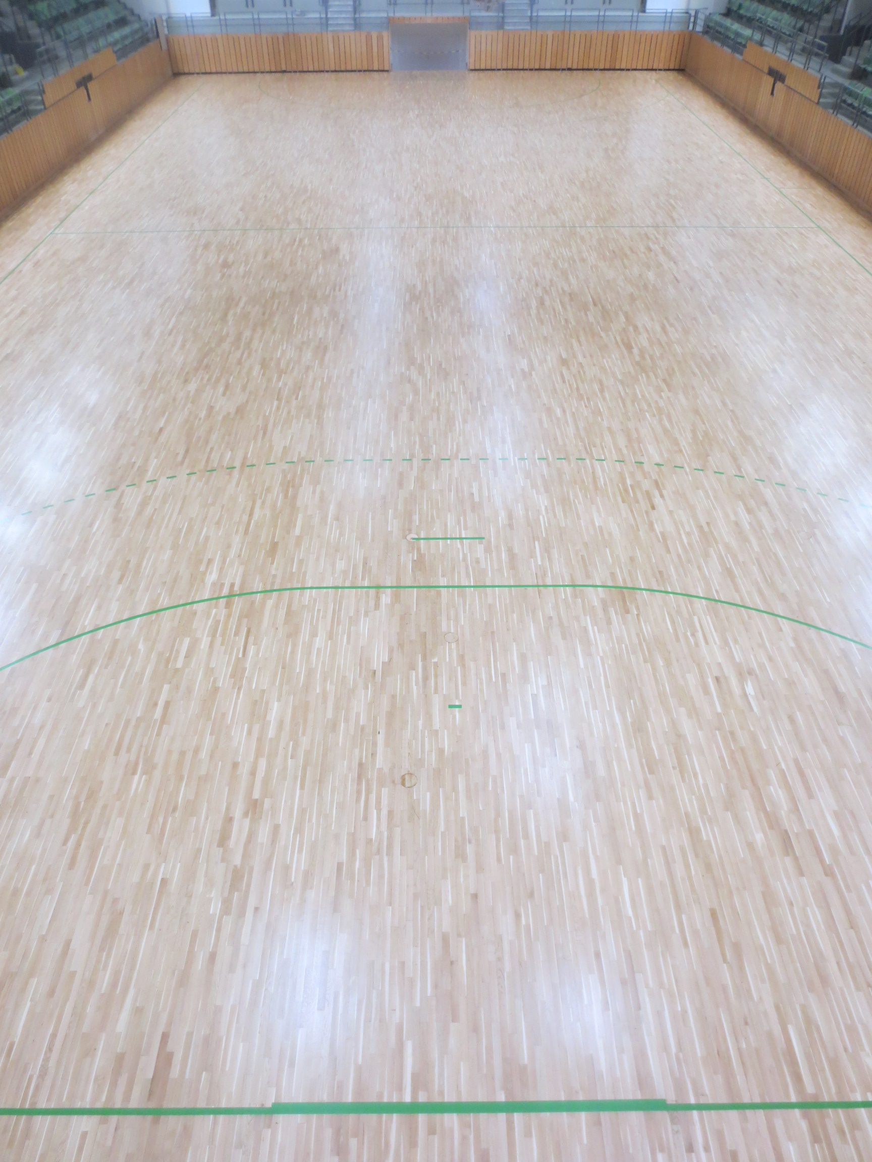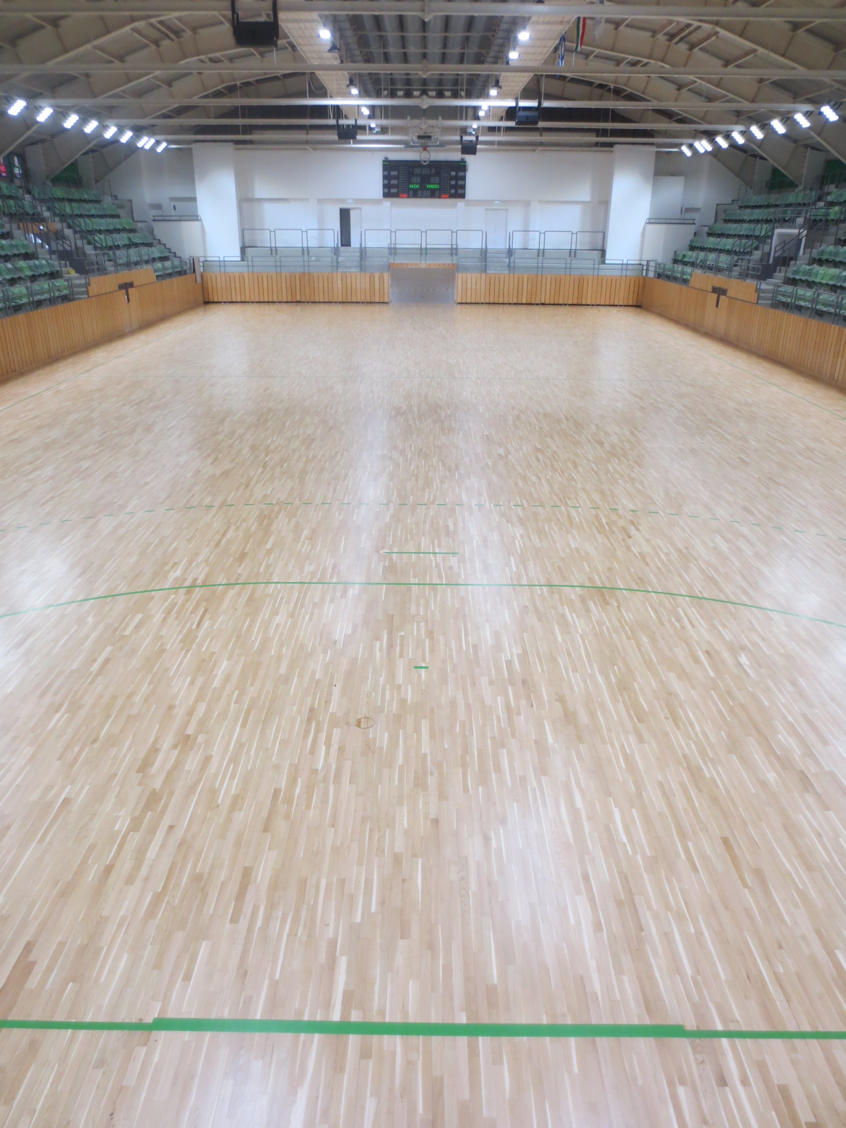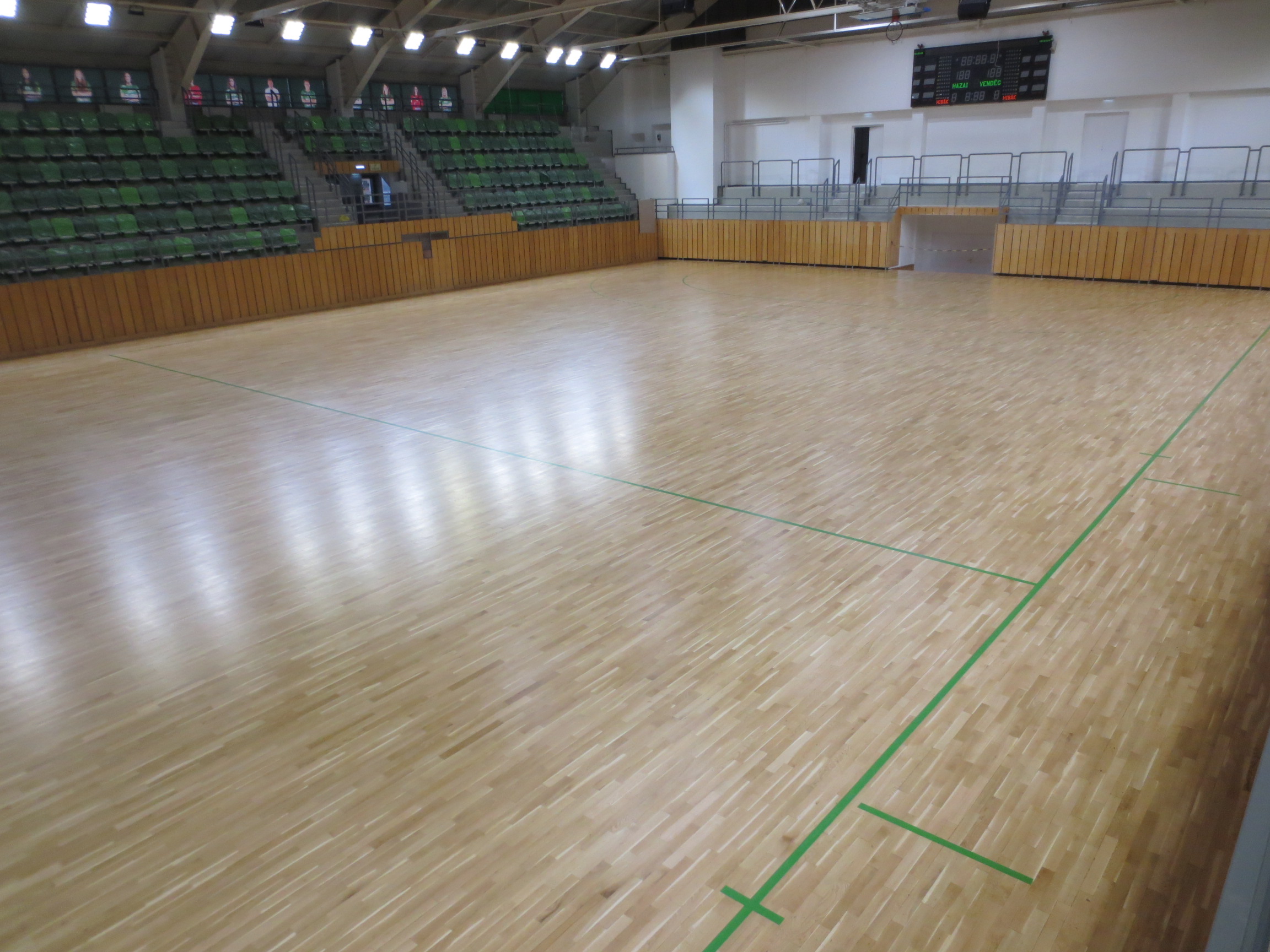 A csiszolást követően a parkettát nagy terhelésre tervezett, sportlétesítményekben alkalmazott lakkrendszerrel kezeltük. Ez a felületkezelés kiemelkedő kopásállóságot, biztonságos tapadást és hosszú élettartamot biztosít, miközben megőrzi a fa természetes megjelenését. A felújítás eredményeként a pálya ismét megfelel a sport- és rendezvényhasználat követelményeinek.