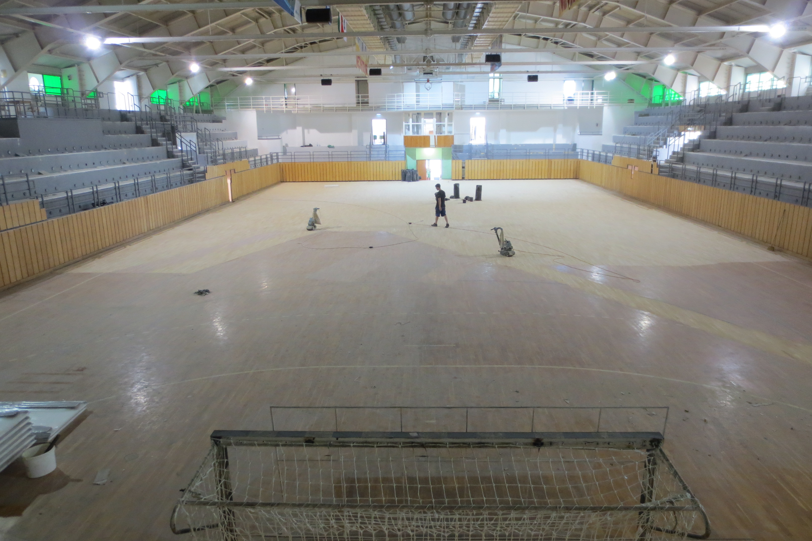 Az Elek Gyula Aréna sportparkettáján teljes körű felújítást végeztünk, amely a nagy igénybevétel miatt elengedhetetlenné vált. A munkálatok során a felületet több lépcsőben csiszoltuk, eltávolítva a kopott lakkréteget, a felületi sérüléseket és az egyenetlenségeket.